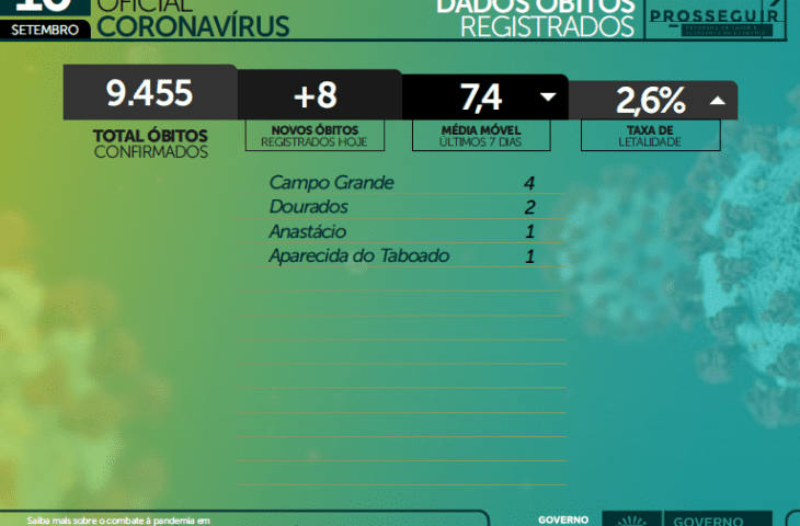 O boletim epidemiológico desta sexta-feira, dia 10, trouxe a confirmação de mais oito novos óbitos, 9.455 no total. Média móvel de 7,4 mortes por dia.