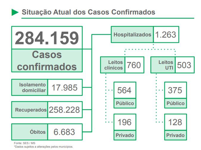 Com média móvel de 1.556,9 e taxa de contágio em 1,05, os municípios que mais registraram novos casos nas últimas 24 horas foram: Campo Grande + 227; Dourados +112; Corumbá +52; Três Lagoas +40 e São Gabriel do Oeste +37.
