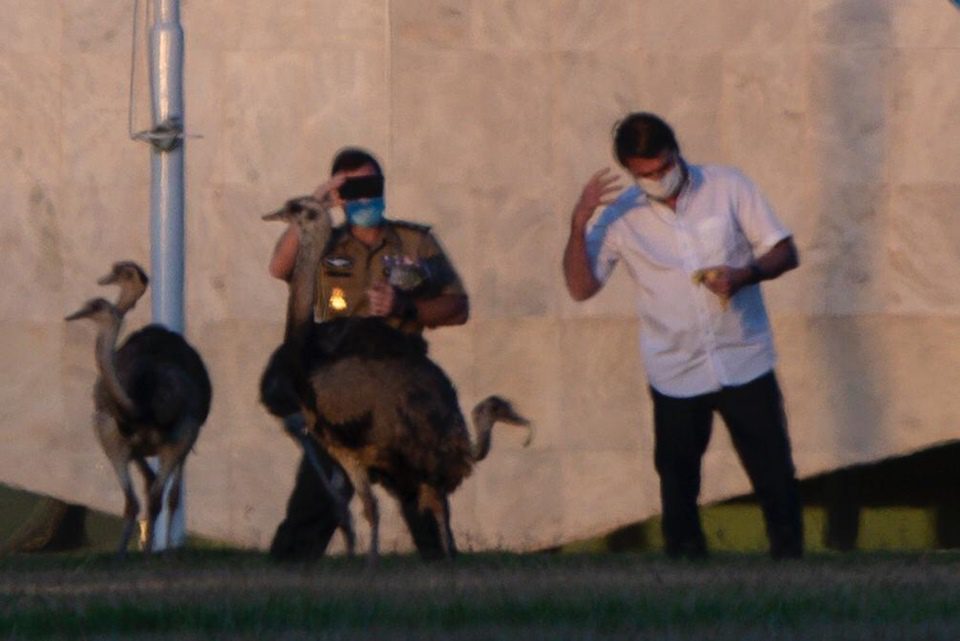 Durante a caminhada, no lado de fora do Palácio, Bolsonaro decidiu alimentar uma ema que estava no gramado. O animal, contudo, não reagiu bem e bicou o chefe do Executivo, conforme registro do site Metrópoles.