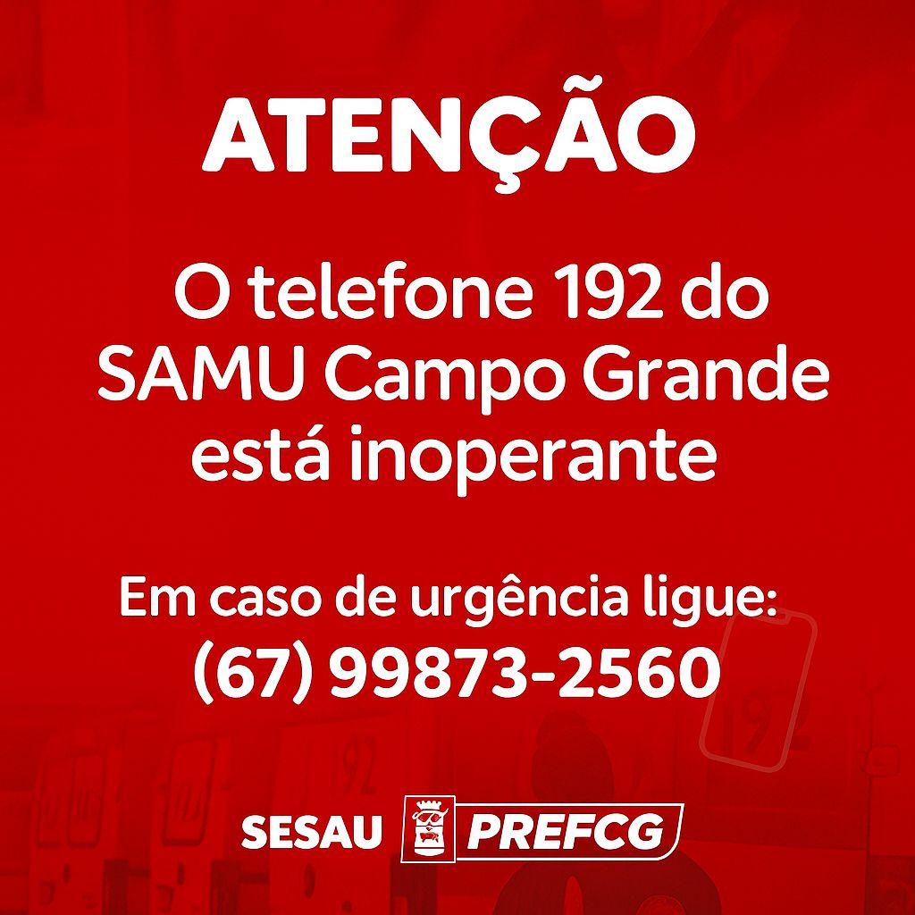 A Secretaria de Saúde (Sesau) e a Prefeitura de Campo Grande informaram, por meio das redes sociais, que o telefone 192 do Serviço de Atendimento Móvel de Urgência (SAMU) está inoperante temporariamente.