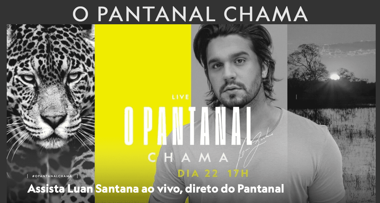 Como bom sul-mato-grossense o cantor Luan Santana, que é nascido em Campo Grande, sempre teve o Pantanal como referência. E como bom brasileiro, também sentiu as dores causadas pela maior queimada das últimas décadas e que afetou boa parte da fauna e flora pantaneira. Foi então que ele criou o ‘Movimento Pantanal Chama’ e, somando forças com o poder público, sociedade civil, institutos sem fins lucrativos e ongs, formaram o movimento para ajudar na recuperação do bioma, das comunidades ribeirinhas, indígenas, quilombolas, dos animais e de todo o Pantanal.