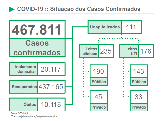 O boletim epidemiológico, divulgado pela Secretaria de Estado de Saúde, nesta terça-feira, dia 15, trouxe a confirmação de mais 16 óbitos por consequência da Covid-19. Ao todo, Mato Grosso do Sul já contabiliza 10.118 mortes.