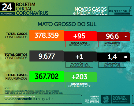 O número de novos casos de coronavírus continua aumentando em Mato Grosso do Sul. Nesta quarta-feira (24), a Secretaria de Estado de Saúde (SES) divulgou mais 95 casos, atingindo a média móvel de 96,6 em sete dias.