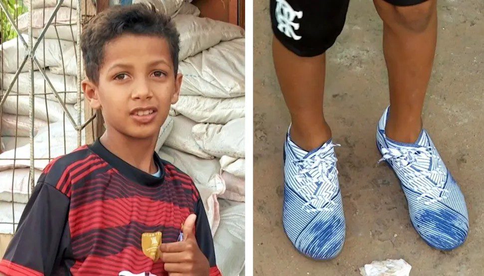 Menino que recebeu chuteira rasgada ganha presente de ex-atacante do Flamengo