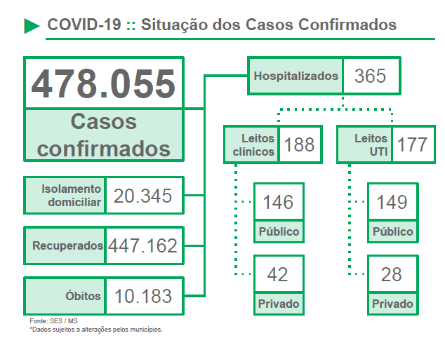Nesta sexta-feira, existem 20.345 casos confirmados em isolamento domiciliar, e outros 365 casos que necessitaram de hospitalização no Estado. São 188 pessoas em leitos clínicos e 177 em UTIs.