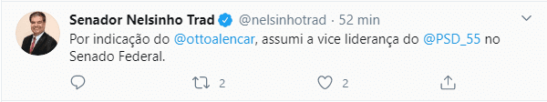 O senador de Mato Grosso do Sul Nelsinho Trad anunciou, nesta terça-feira (13), que assumiu a vice-liderança do PSD no Senado Federal, após indicação do senador e líder do partido, Otto Alencar.