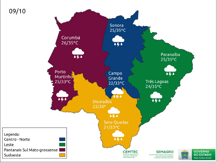 Estimativa do Centro de Monitoramento do Tempo e do Clima (Cemtec) aponta para a chance de tempestades acompanhadas de raios, rajadas de vento (30-60Km/h) e eventual queda de granizo nas regiões sudeste, central e leste, e porção sul da região pantaneira.